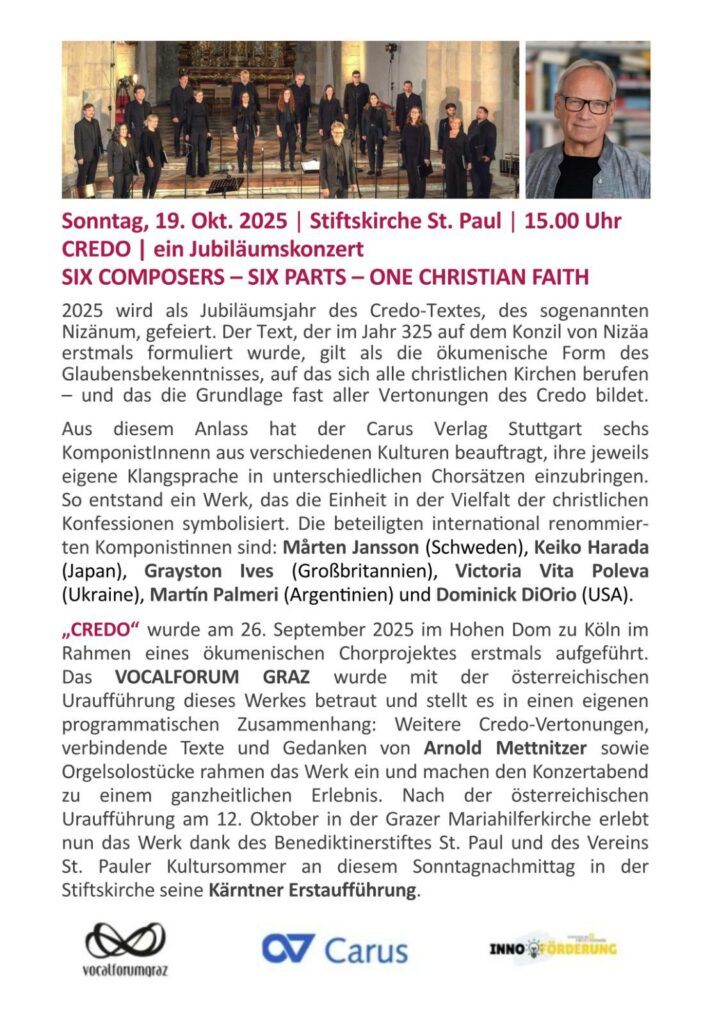 Am 19. Oktober 2025 um 15 Uhr in der Stiftskirche St. Paul im Lavanttal gibt es ein außergewöhnliches Konzert, das ihr euch nicht entgehen lassen solltet: Das renommierte Vocalforum Graz unter der Leitung von Franz Herzog bringt sechs Komponisten, sechs Klangwelten und einen gemeinsamen Glauben zum Erklingen.