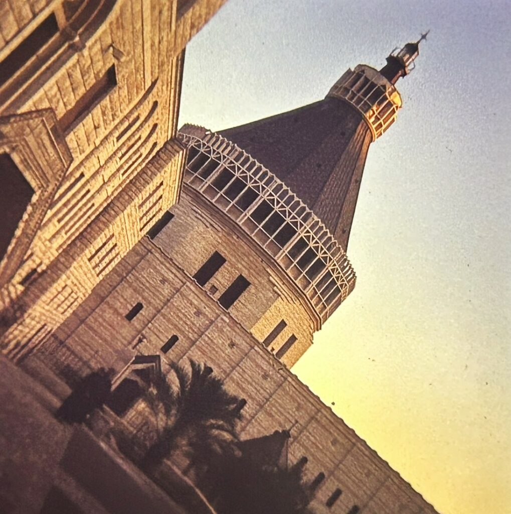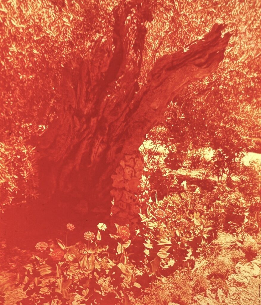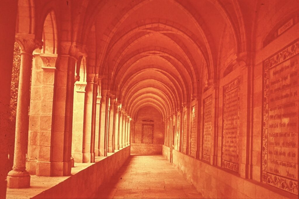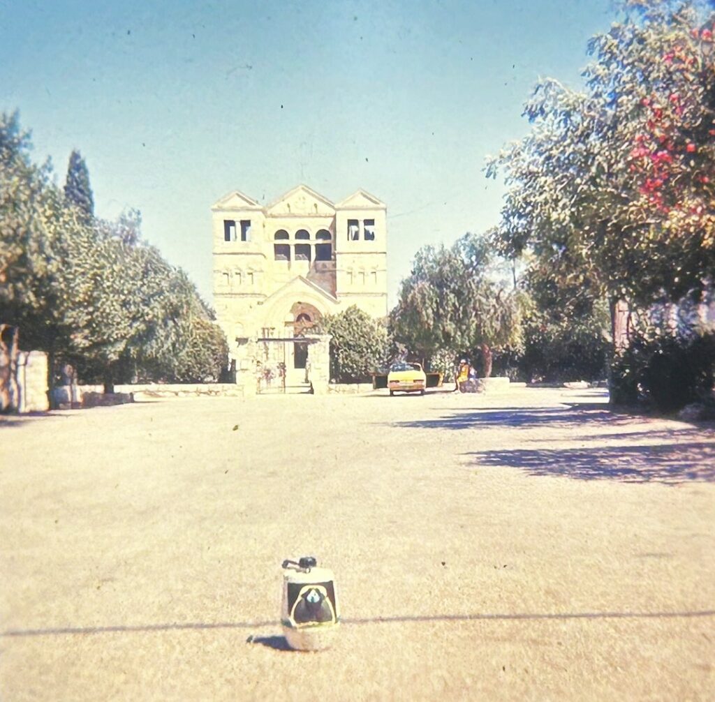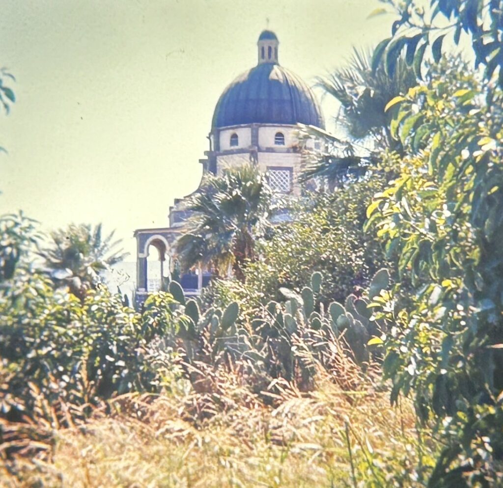 Um 1977: Zu dieser Zeit war der Berg der Seligpreisungen bereits eine etablierte Pilgerstätte. Die Umgebung wurde in den Jahren zuvor durch die Anlage der Gärten und des Klosters weiter gestaltet. Die umliegende Landschaft bietet einen Blick auf den See Genezareth und das Gebiet, in dem Jesus gewirkt hat.