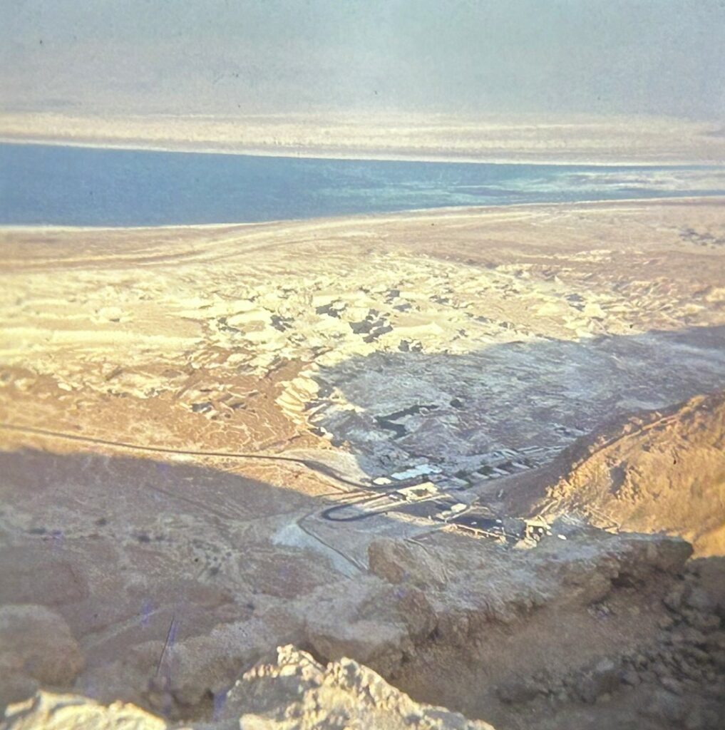 Blick von Masada (Metzada) auf das Tote Meer im Jahr 1977 nach der Errichtung der Seilbahn