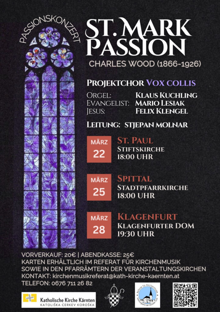 Am Sonntag, dem 22. März, um 18 Uhr in der Stiftskirche St. Paul/Lavanttal, am Mittwoch, dem 25. März, um 18 Uhr in der Stadtpfarrkirche Spittal/Drau und am Samstag, dem 28. März, um 19.30 Uhr im Klagenfurter Dom wird die Markus-Passion erklingen. Der eigens dafür zusammengestellte Projektchor „Vox collis“ besteht aus rund 60 Sängerinnen und Sängern aus Kärnten, Graz und Tirol. Die Basis bilden der Stiftschor St. Paul/Lav. und der Singkreis Wolfsberg. An der Orgel spielt der Klagenfurter Domorganist Klaus Kuchling.