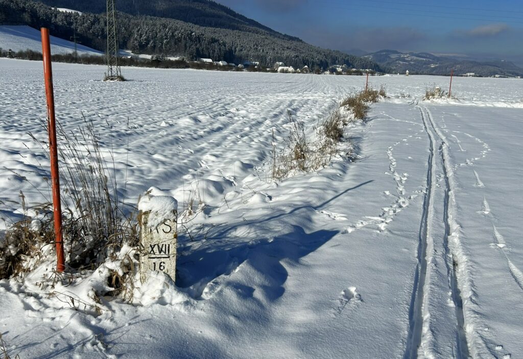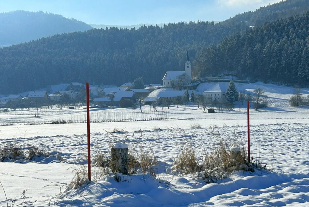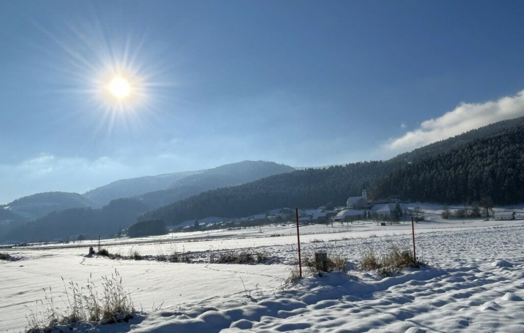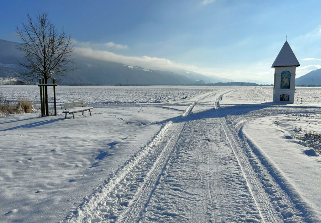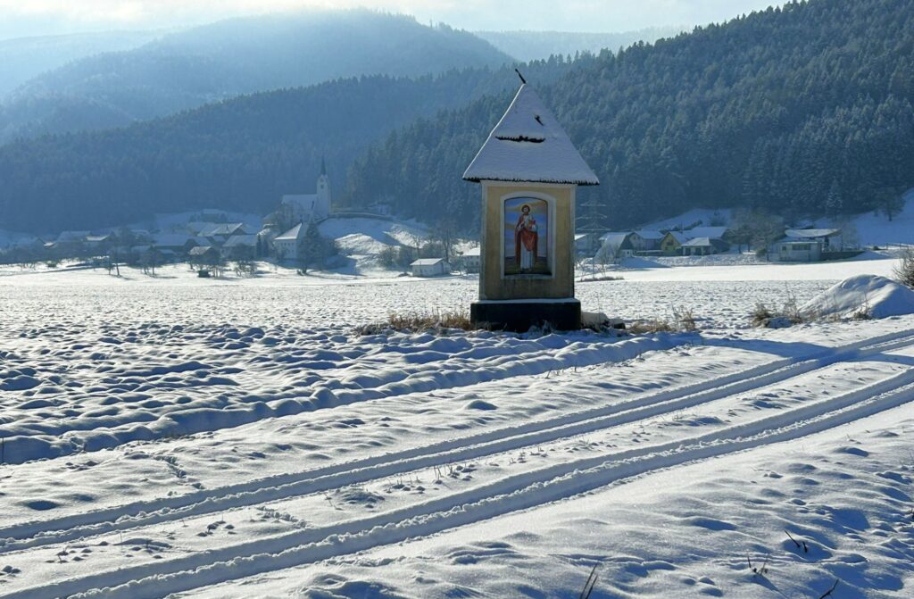 Der Wintersonne entgegen über die Bacher Felder zu Damijan Cehners Aviofun in Libeliče