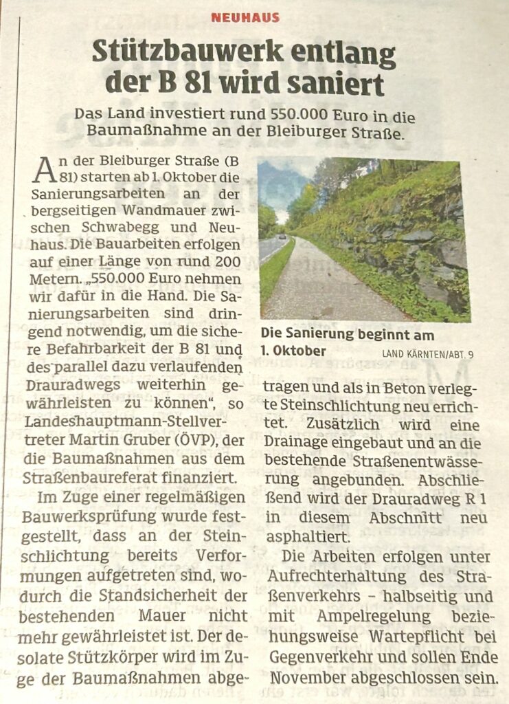 Die Sanierung der Wandmauer an der B 81 und am Drauradweg in Motschula hat begonnen #