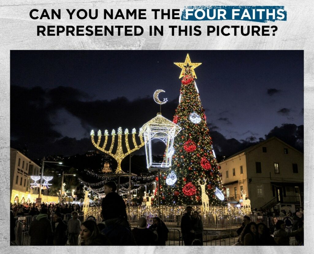 Lights of every tradition glow together in the city of Haifa – a Menorah for Chanukah, a crescent & a Christmas tree, with the Bahá’í shrine shining in the background. A celebration where our holidays light up the night side by side.