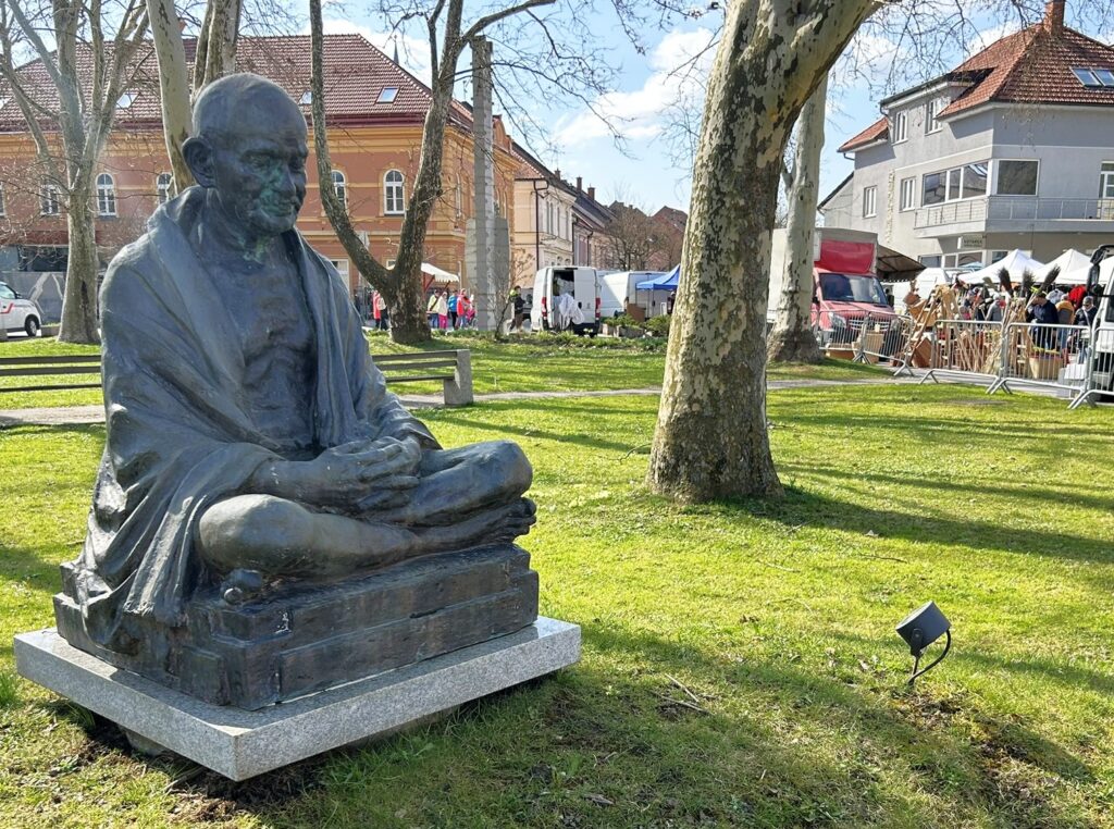Unter den wachsamen Augen (wieder ohne Brille) von Mahatma Gandhi