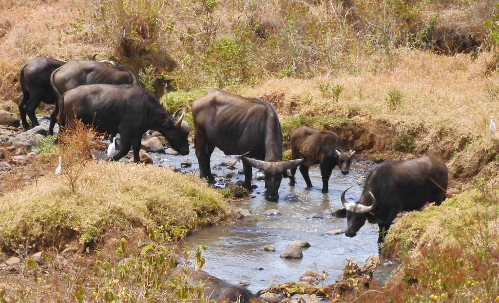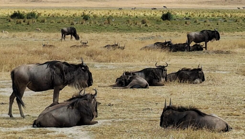 Auf relativ kleiner Fläche leben im Ngorongoro-Krater ca. 25.000 Wildtiere, darunter fast alle ostafrikanischen Großwildtiere. Damit verfügt das Wildschutzgebiet über die höchste Tierpopulation der Erde. Die Kraterhänge sind größtenteils bewaldet, sein Grund in 600 Metern Tiefe ist hingegen mit Grasflächen bewachsen. Dort kannst du Löwen, Elefanten, Büffel, Giraffen, Zebras, Gnus und Warzenschweine antreffen. Vielleicht begegnen dir sogar einige Spitzmaulnashörner, die vom Aussterben bedroht sind.