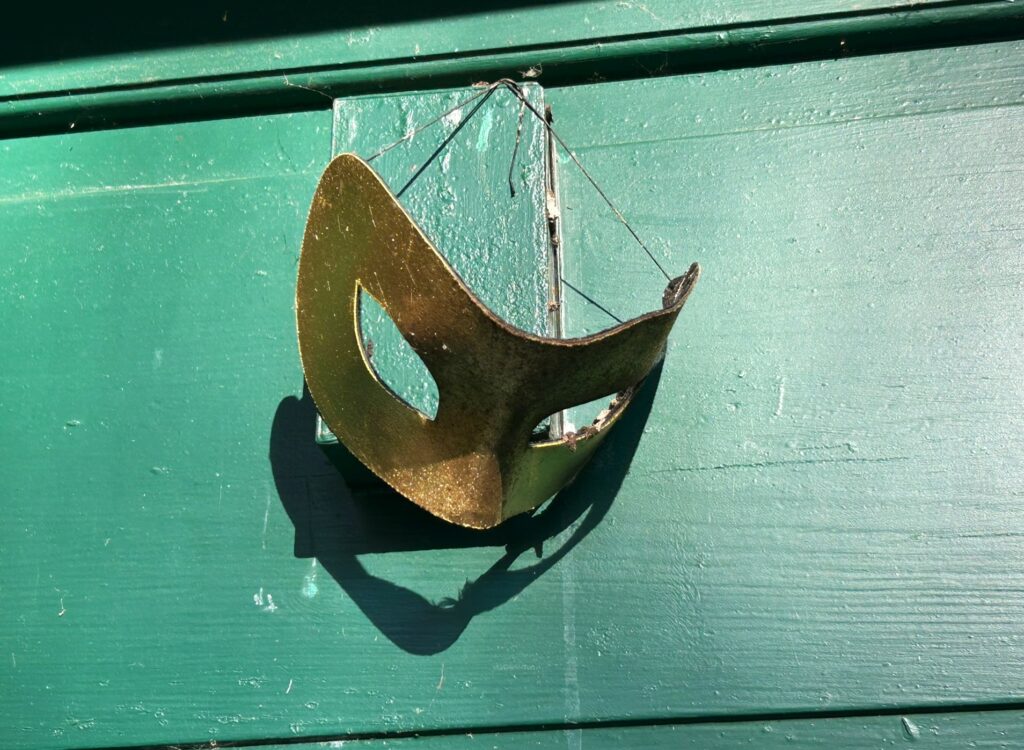 Der Besitzer hat seine Maske aus Venedig als Markenzeichen an der Tür platziert