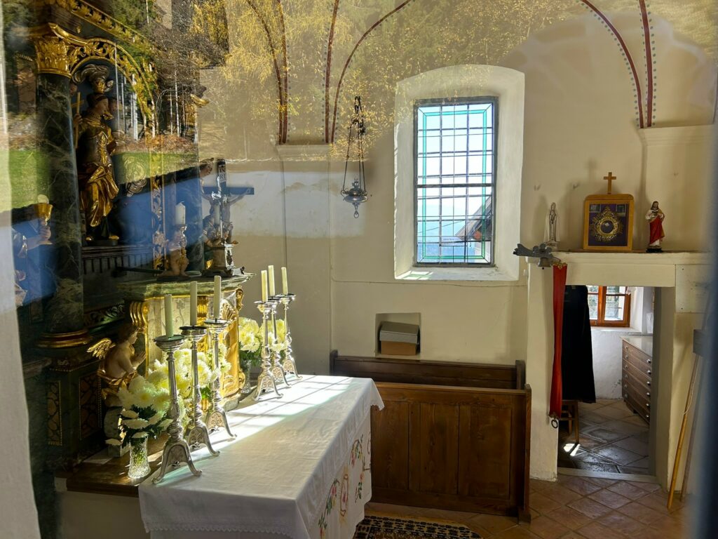 Blick durch das Kirchenfenster auf den Hauptaltar