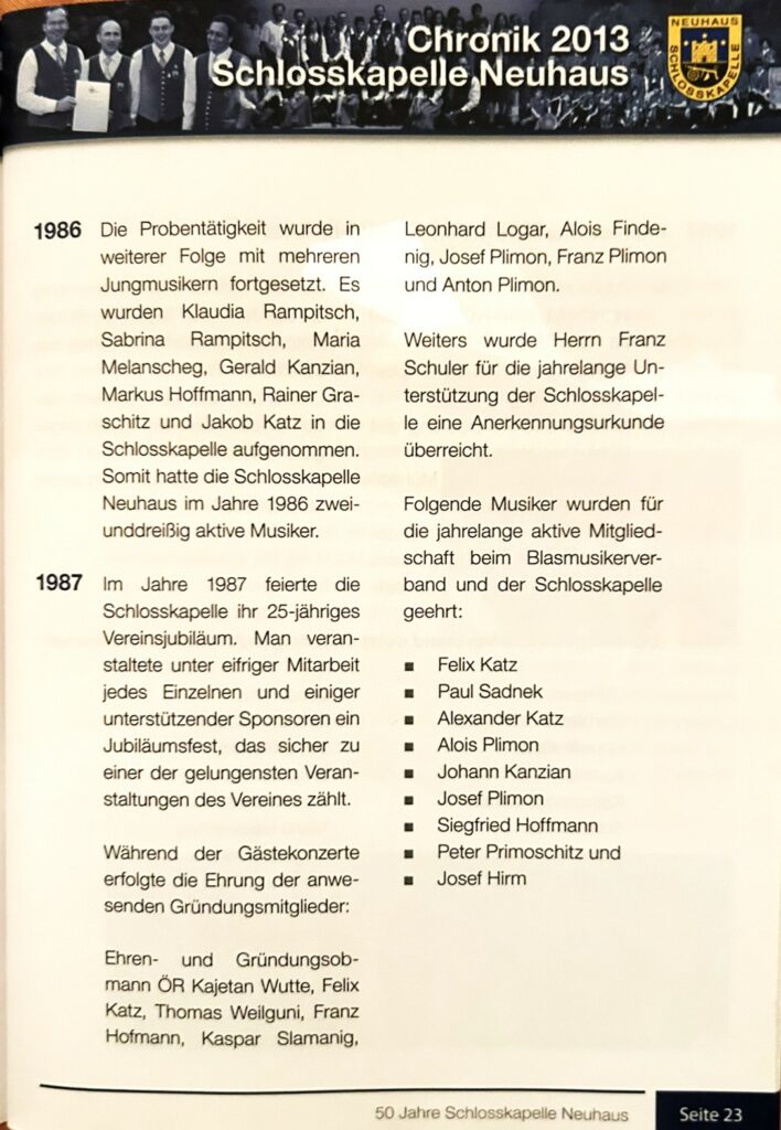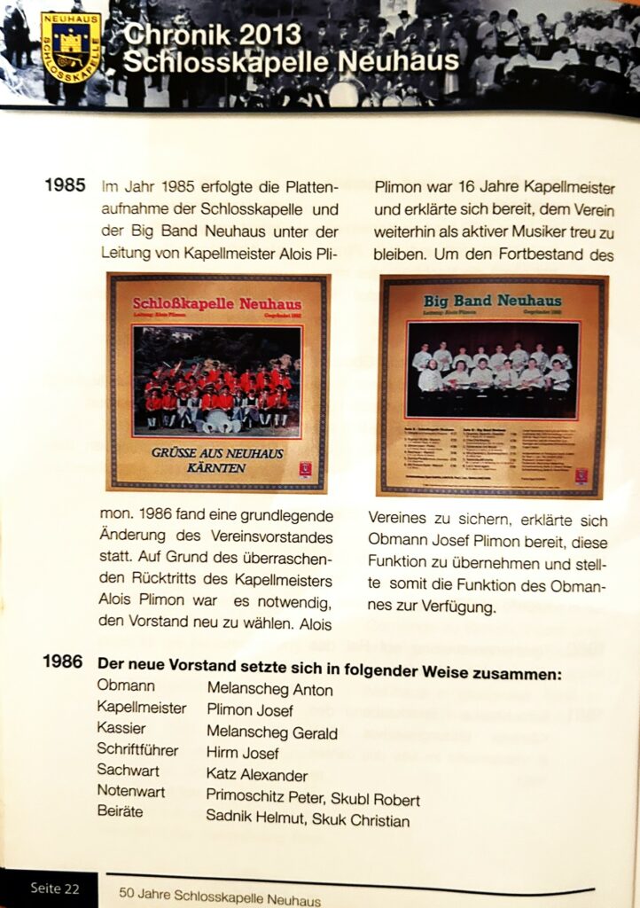Die Schlosskapelle Neuhaus in den Jahren rund um das 25jährige Bestandsjubiläum mit Kapellmeister Josef Plimon und Obmann Anton Melanscheg
