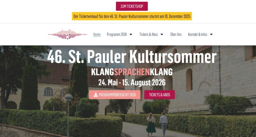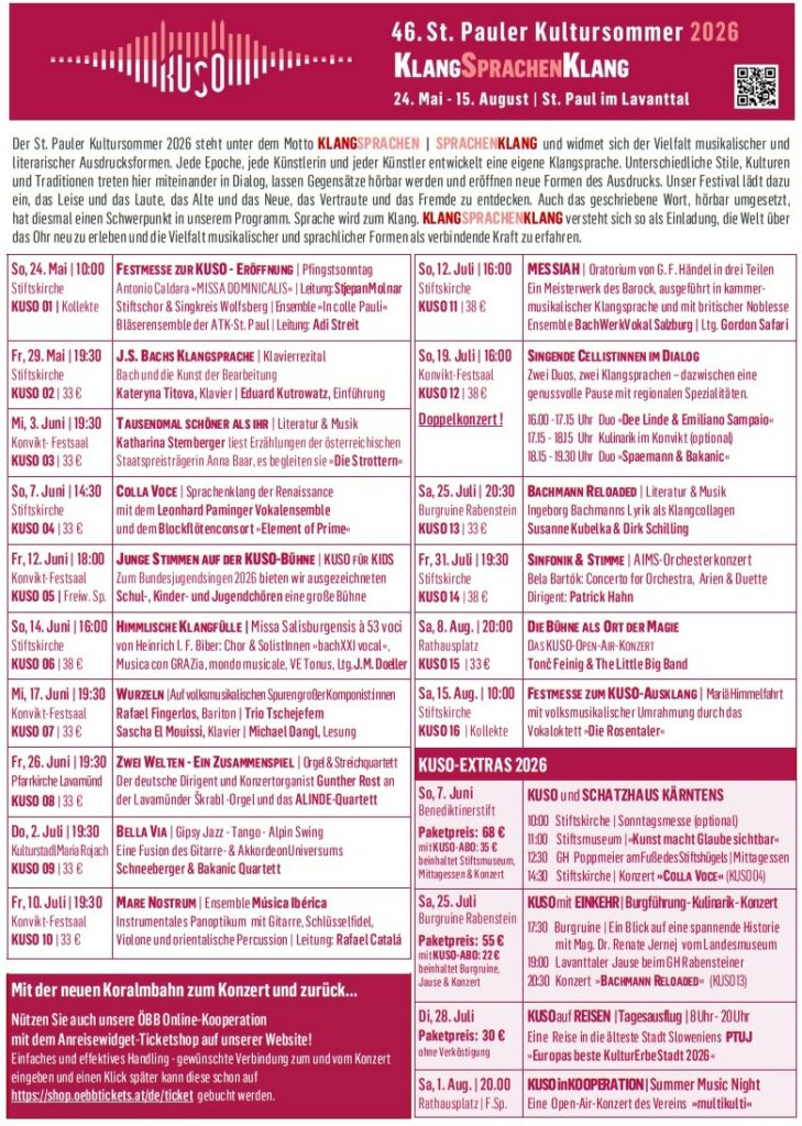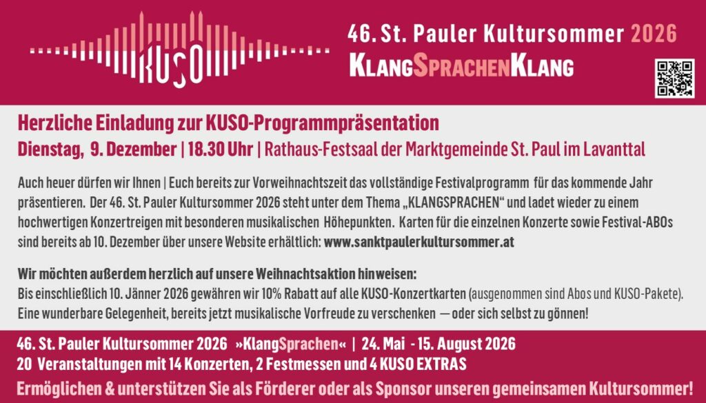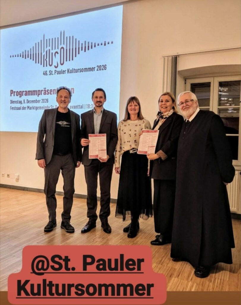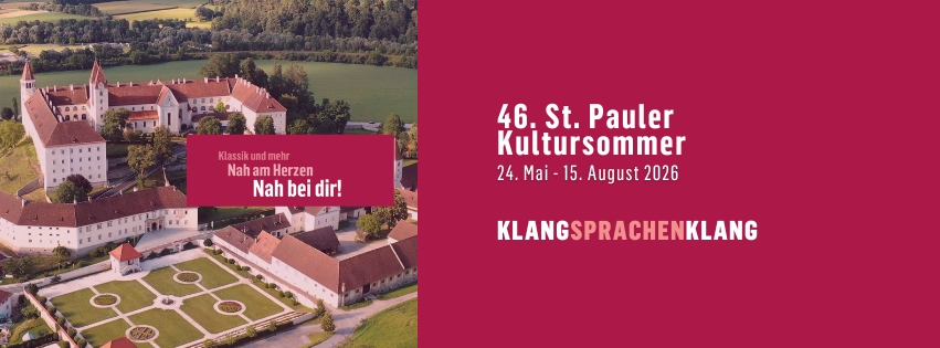 Der St. Pauler Kultursommer 2026 mit dem Titel KLANGSPRACHEN | SPRACHENKLANG widmet sich der Vielfalt musikalischer, aber auch literarischer Ausdrucksformen. Jede Epoche, jeder Komponist, jede Komponistin, jeder Künstler und jede Künstlerin besitzt eine eigene Klangsprache. Unterschiedliche Stile, Kulturen und Traditionen begegnen einander, lassen Gegensätze hörbar werden und verschmelzen zu neuen Formen des Ausdrucks. Wir laden ein, die Eigenheiten einzelner „Klangsprachen“ zu entdecken – das Leise und das Laute, das Alte und das Neue, das Vertraute und das Fremde. In dieser Begegnung entsteht ein Dialog, der jenseits von Worten verständlich ist: unmittelbar, sinnlich, universell. Jedes gesprochene Wort wird zum Klang – es fließt zwischen den Silben, tanzt auf den Lippen und trägt den Sinn, noch ehe es gedacht ist. Der Sprachenklang jedes gesprochenen Textes wird leise Musik der Worte, ein Flüstern zwischen Sinn und Seele. KLANGSPRACHENKLANG versteht sich als Einladung, die Welt über das Ohr neu wahrzunehmen und die Vielstimmigkeit musikalischer Stile und Kulturen als Bereicherung und gemeinsame Sprache zu erleben.
