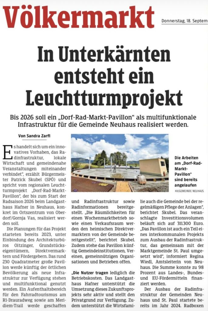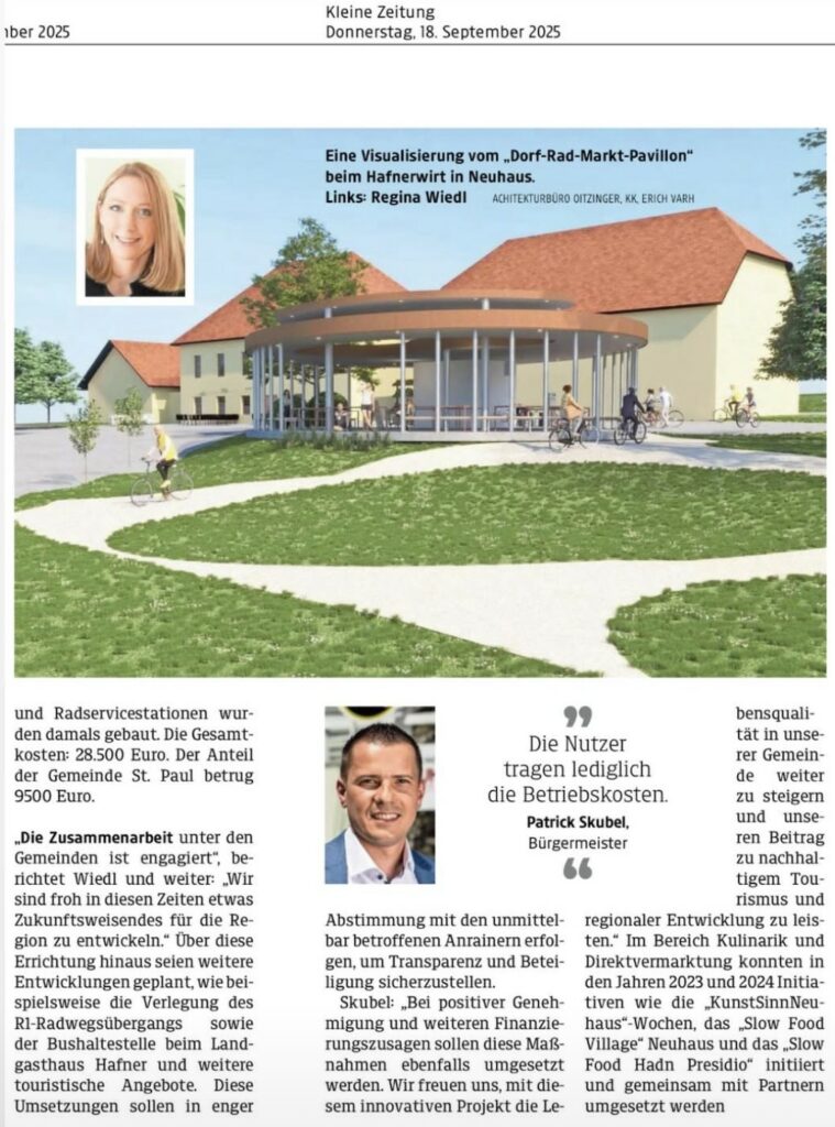 Bei den Umsetzungen von 2 und 3 erfolgen in den nächsten Schritten enge Abstimmung mit den unmittelbar betroffenen Anrainer:innen, um Transparenz und Beteiligung sicherzustellen. Die Finanzierung erfolgt über verschiedene Landes-, Bundes- und EU-Förderstellen (Leader, Orts- und Regionalentwicklung, See-Berg-, Wander-Rad und Interkommunale Zusammenarbeit). Ein besonderer Dank gilt der Wirtsfamilie Rupitz, die das Projekt durch die Bereitstellung von Grundstücken, Strom- und Wasserzugang sowie Mithilfe bei der Pflege unterstützt. Weitere finanzielle Beteiligungen werden im Rahmen der laufenden Planungen geklärt. Mit dem Dorf-Rad-Markt-Pavillon schafft die Gemeinde Neuhaus eine zukunftsweisende Infrastruktur, die Radinfrastruktur, lokale Wirtschaft, Ortsentwicklung und gemeindenahe Veranstaltungen miteinander verbindet und zugleich eine lang ersehnte Ortsbildgestaltung umsetzt, die auch die Wirtschaft stärken wird.