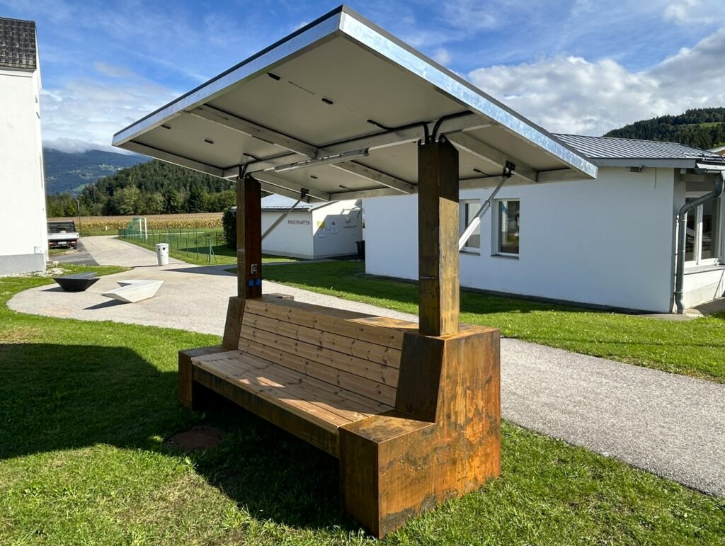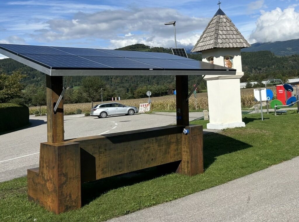 Powerbank von Neuhaus: Sitzgelegenheit und dank PV Modulen und Steckdosen gibt es hier auch bei Netzausfall Strom