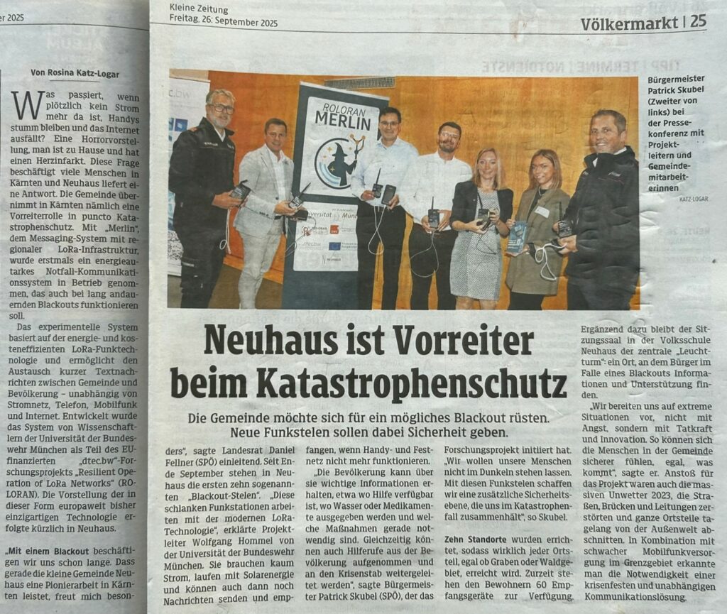 Nach einer Testphase mit prototypischen Umsetzungen ab September 2024 erfolgte im September 2025 eine flächendeckende Umsetzung. In diesem Zuge wurden zehn umgebaute Telefonzellen („MERLIN Basen“) im Gemeindegebiet aufgestellt sowie mehrere Dutzend Endgeräte für zu Hause („MERLIN Messenger“) der Bevölkerung zur Verfügung gestellt. Danke der Universität der Bundeswehr München, die der Gemeinde Neuhaus für das Projekt auf Basis von EU-Next-Generation– und dtec.bw-Fördergeldern eine Forschungssubvention iHv. EUR 150.000,00 zur Verfügung gestellt hat und somit ermöglichte, dass Teile des Forschungsprojekts mit unseren heimischen Firmen umgesetzt werden konnten.