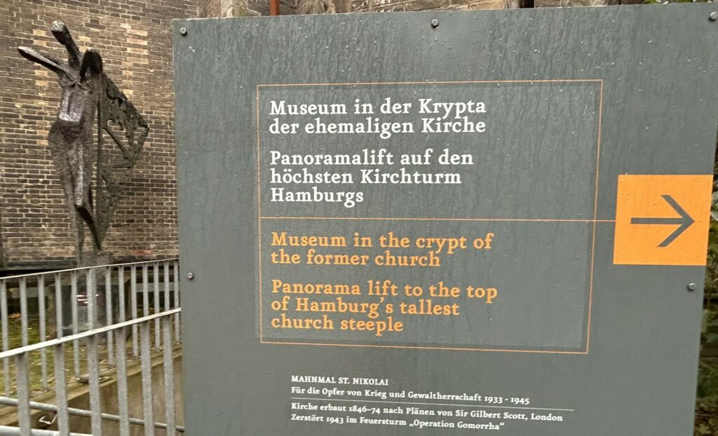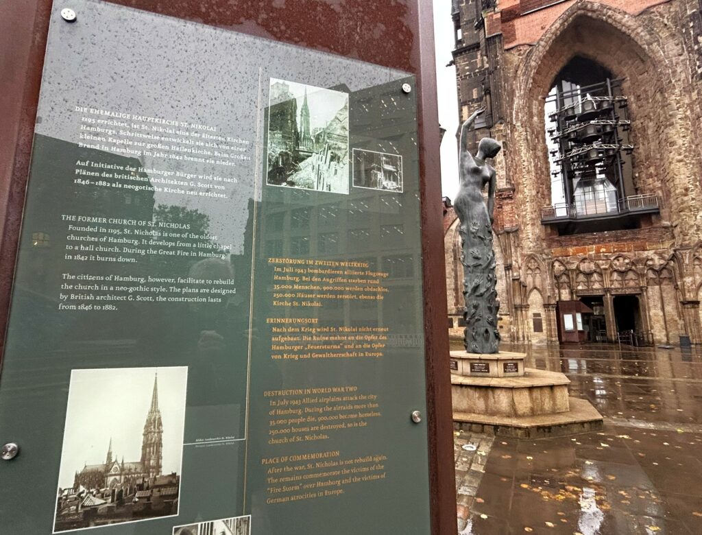Die Ruine der Hauptkirche St. Nikolai am Hamburger Hopfenmarkt ist als Mahnmal St. Nikolai „den Opfern von Krieg und Gewaltherrschaft zwischen 1933 und 1945“ gewidmet. Die Kirche wurde 1195 begründet und in ihrer letzten neugotischen Ausführung 1874 fertiggestellt. Ihr 147,3 Meter hoher Turm war von 1874 bis 1877 das höchste Bauwerk der Welt.[1] Die Hauptkirche St. Nikolai wurde 1962 als Neubau in den Stadtteil Harvestehude nahe dem Klosterstern verlegt. Nach den Kriegszerstörungen von 1943 und dem weitgehenden Abriss 1951 sind heute neben dem Turm noch ein Teil der südlichen Außenmauer und die Wände des Chors erhalten.