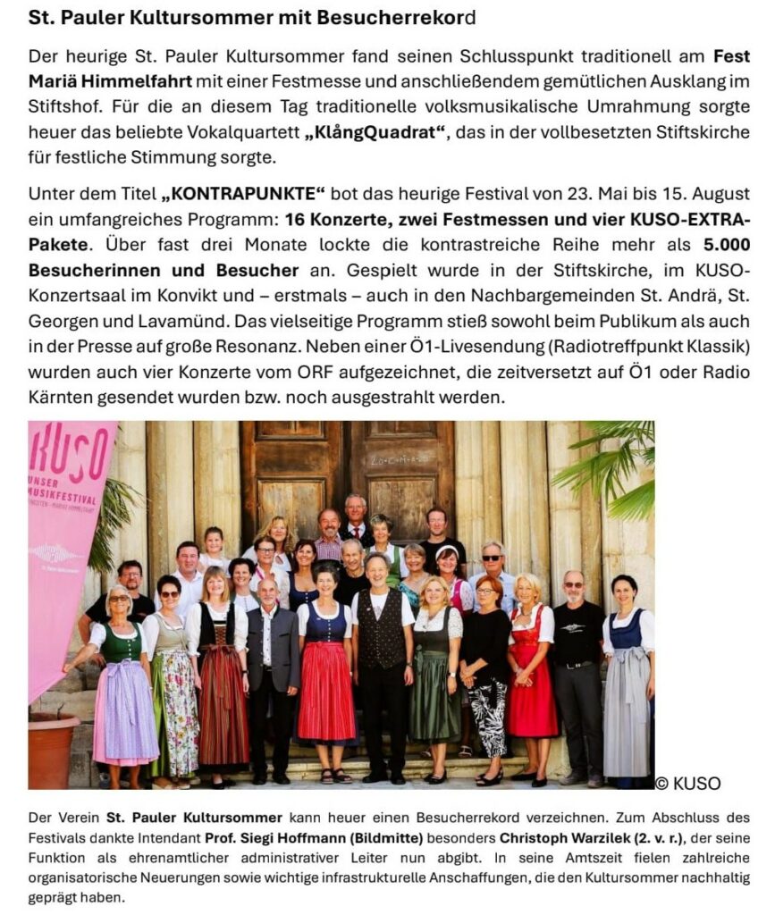 Traditionelle Muttertagsfeier des Neuhauser Seniorenbundes im Gasthaus SternjakZum Gedenken an Werner GuntschnigJohann Sebastian Bach Messe eröffnete den Konzertreigen der Kontrapunkte zum St. Pauler Jubiläumskultursommer 2025Zum Gedenken an Rudolf UrbanÖW-Chefin Astrid Steharnig-Staudinger immer im MittelpunktAmoklauf in Graz – Dreitägige StaatstrauerCongratulations dem Pihalni orkester Šentjanž (70 let) zum großen Jubiläumskonzert in DravogradZum 4. Kärntner Harmonikawettbewerb wurde auf den Marktplatz nach Weitensfeld geladen. Sieben Finalisten stellten sich einer hochkarätigen Jury. Radio Kärnten hat live übertragen, der Wettbewerb ist auch online per Stream zu sehen gewesen. # ORF Kärnten – Strahlende Siegerin ist Laura Rampitsch aus NeuhausFünf Tage Genussradeln im Salzkammergut – Eine Runde um den Hallstätter See von Bad Goisern zu den Chinesen in HallstattTraunseeGenussRadeln via Traunkirchen zum Fat House & Car bei der Kaiservilla in Bad IschlSchlosskapelle Neuhaus sorgt für grandiosen Frühschoppen beim Bacher PfingstfeuerwehrfestEhrengäste strahlen mit der Pfingstsonne um die WetteGeburtstagsständchen für den Walzerkönig Johann Strauss beim St. Pauler Kultursommer mit dem Robert Stolz Orchester Graz-Wien
