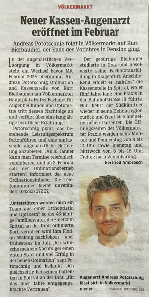 Augenarzt Dr. Andreas Pototschnig neu in Völkermarkt #