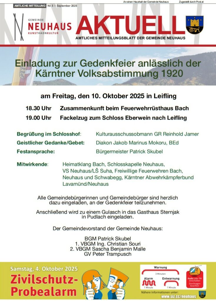 Mit dem traditionellen Fackelzug und einer würdigen Gedenkfeier vor dem Schloss Leifling gedachte die Gemeinde Neuhaus der 105. Wiederkehr des Tages der Kärntner Volksabstimmung vom 10. Oktober 1920. Herzlicher Dank allen, die zu einem dem Anlass entsprechenden Verlauf der Feierstunde beigetragen haben!