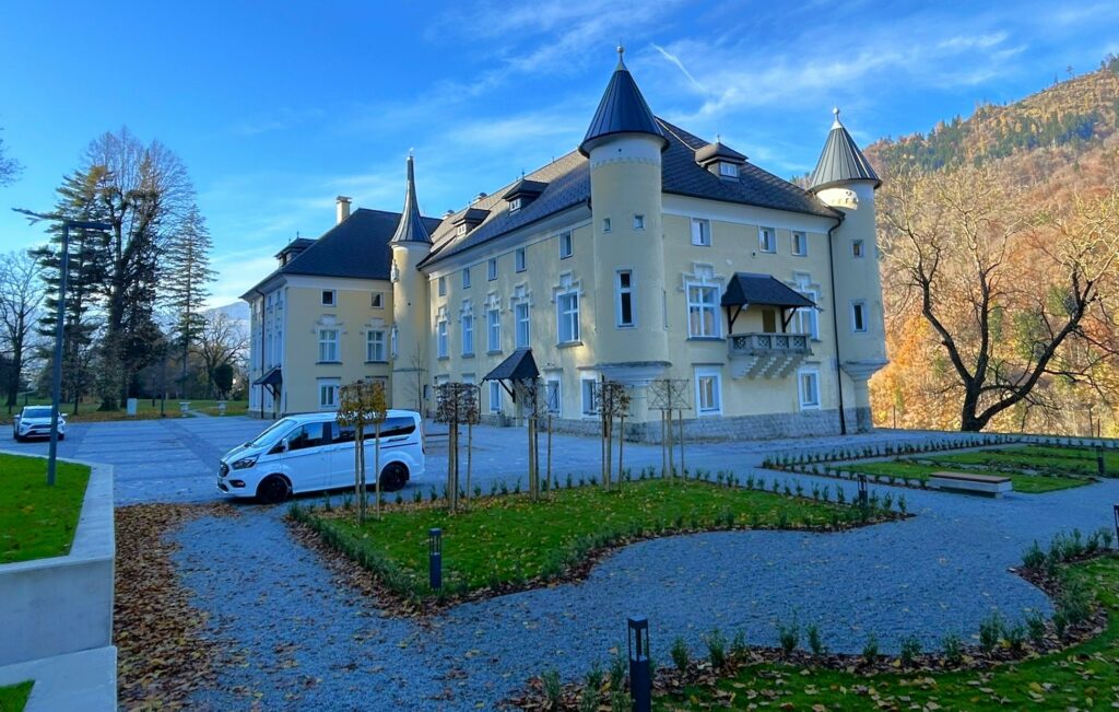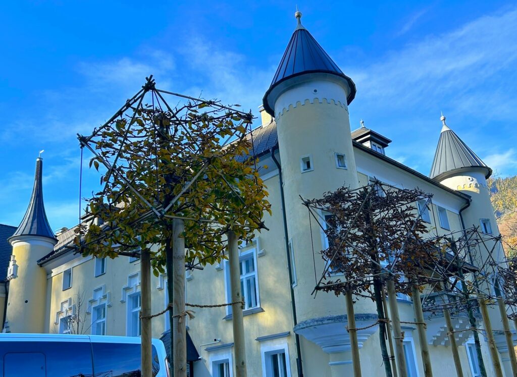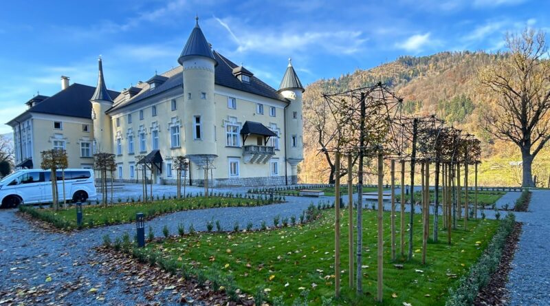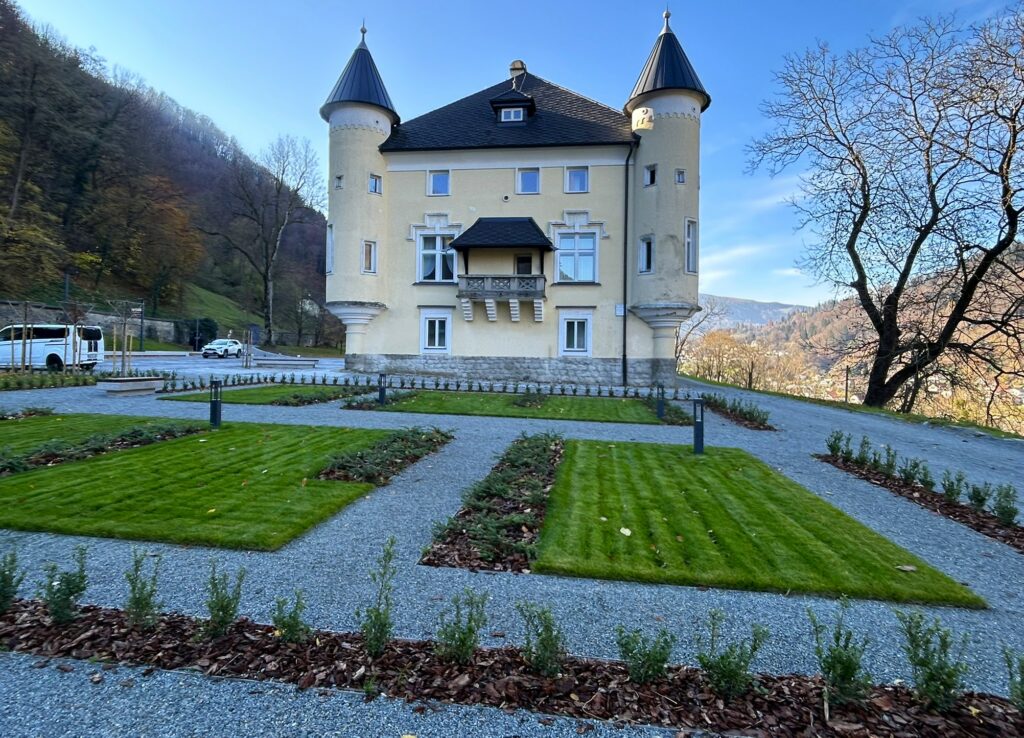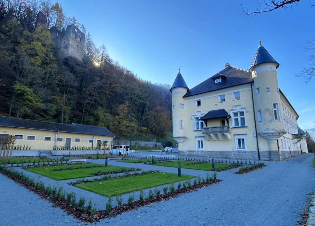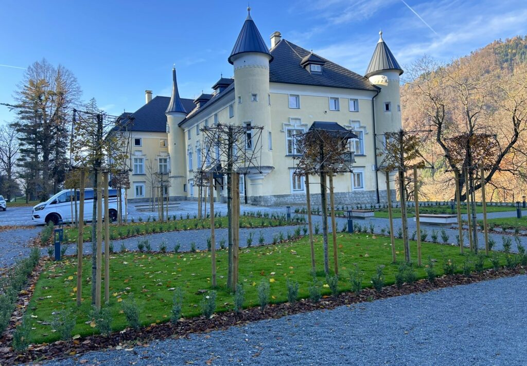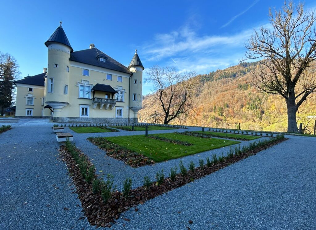 Sehr schöne Neugestaltung des Parks und der Außenanlagen von Dvorec Bukovje/Schloss Pöckstein