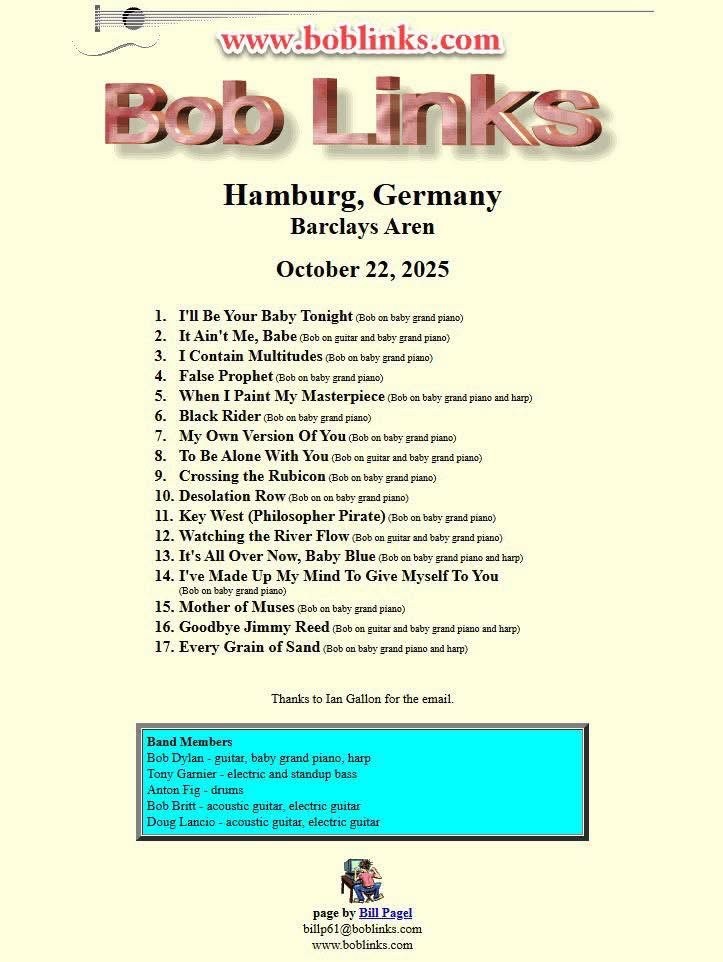Die Songliste der Dylan-Konzerte ist identisch mit seinen Auftritten in Helsinki, Stockholm und Kopenhagen an den Tagen zuvor