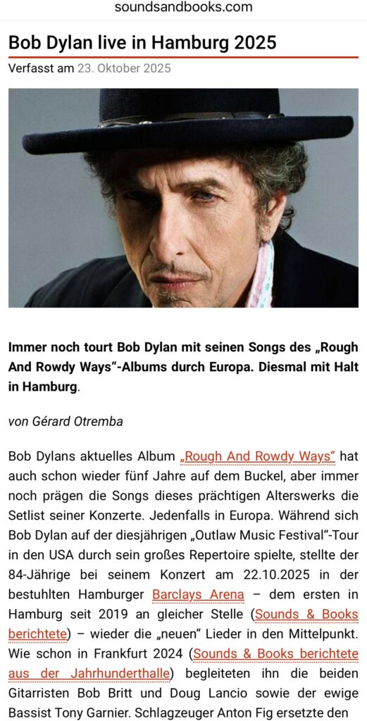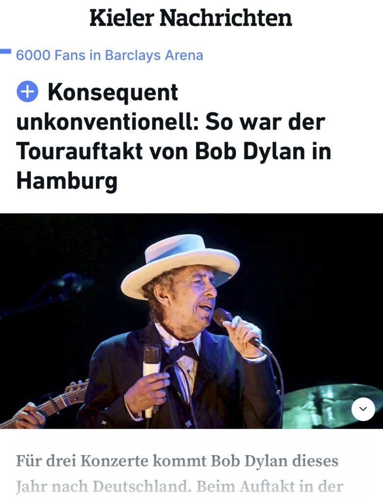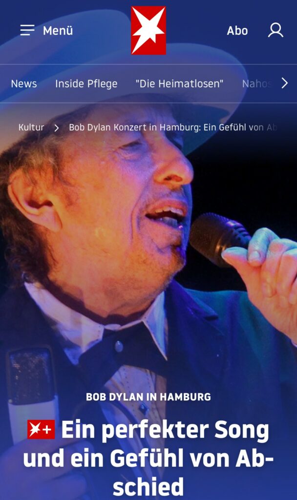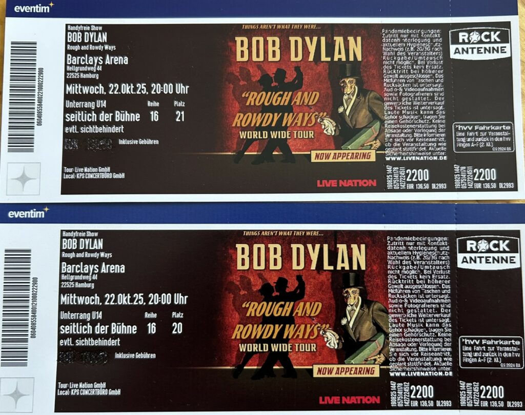 Unvergessliches, großartiges Konzert von Bob Dylan in der riesigen Barclays Area in Hamburg als handyfreies Musikerlebnis mit Songs, die mein Leben nun schon 70 Jahre lang begleiten #